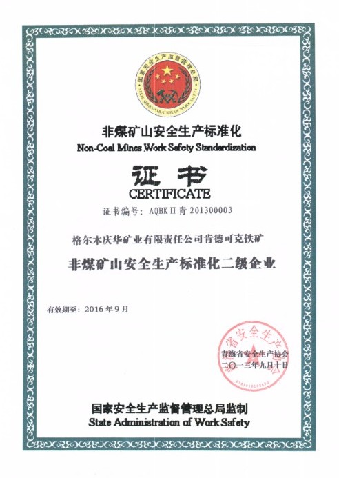 中國慶華青海消息(徐芳)近日,格爾木礦業(yè)公司肯德可克鐵礦獲得了青海省安全生產(chǎn)協(xié)會(huì)頒發(fā)的非煤礦山安全生產(chǎn)標(biāo)準(zhǔn)化證書和“非煤礦山安全生產(chǎn)標(biāo)準(zhǔn)化二級(jí)企業(yè)”稱號(hào)。