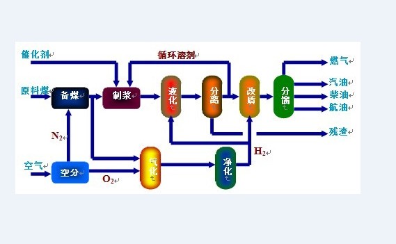 煤直接液化,將煤在氫氣和催化劑作用下通過液化生成粗油,再經加氫精制轉變為汽油、柴油等石油燃料制品的過程,因液化過程主要采用加氫手段,故又稱煤加氫液化法。煤直接液化典型的工藝過程主要包括煤的破碎與干燥、煤漿制備、催化劑制備、氫制取、加氫液化、固液分離、液體產品分餾和精制,液化大規模制備氫氣通常采用煤氣化或者天然氣轉化。
